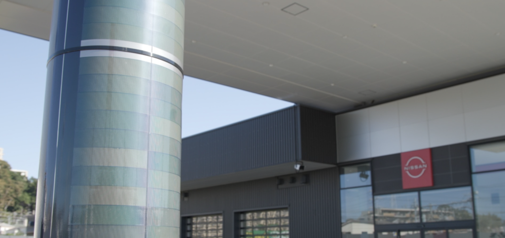 2025年10月から、神奈川県内の日産販売店において画期的な実証が始まっています。店舗のガラス面だけでなく、入り口のキャノピー(ひさし)を支える円柱にPXP製のフレキシブルCIS太陽電池を巻きつけています。